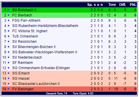 SV Rohrbach II: Herbach, Marius - Bosslet, Marc - Schmitz, Stephan - Scholler, Simon - Stoll, Gerrit - Böning, Sebastian - Martin, Daniel - Jung, Felix - Lang, Dennis - Abel, Carsten - Wunn, Marc Kevin; Spielerwechsel: (68.) Scholler, Simon Schreck, Simon - (73.) Wunn, Marc Kevin Pfeifer, Niklas - (82.) Lang, Dennis Schiffer, Fabian
