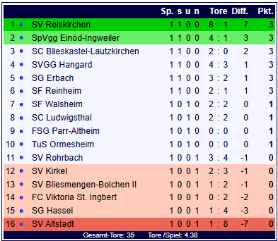 Der Start in der die Landesliga Ost hatte einiges zu bieten: Der SV Reiskirchen feiert einen 8:1-Kantersieg gegen den SV Altstadt, die SF Reinheim gewinnen das Duell der Aufsteiger gegen den SV Bliesmengen-Bolchen II mit 2:1 und die SpVgg Einöd-Ingweiler feiert einen 4:1-Auswärtssieg bei der SG Hassel. Alle Spiele und alle Tore auf SCB-Online...