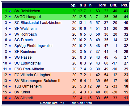 Durch den Auswärtssieg behauptet der SV Reiskirchen mit 43 Punkten und einem Torverhältnis von 63:23 den 1. Tabellenplatz. Die SpVgg Einöd-Ingweiler bleibt nach der Niederlage mit 32 Punkten und 48:47 Toren auf Rang 6 der Tabelle.