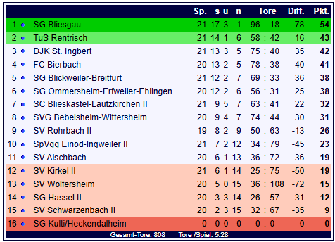 Vor 130 Zuschauern leitete Schiedsrichter Markus Koob die Begegnung. Der TuS Rentrisch steht mit 43 Punkten auf Rang 2 und weist ein Torverhältnis von 58:42 auf. Die SG Blickweiler-Breitfurt verbessert sich auf 38 Punkte und Rang 5 bei einem Torverhältnis von 69:33.