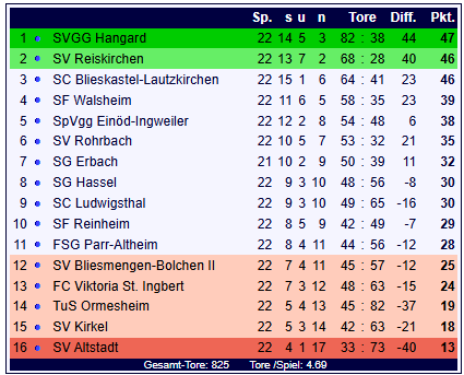 Schiedsrichter Jonas Lang leitete die Partie. Die SVGG Hangard behauptet mit 47 Punkten den ersten Tabellenplatz bei einem Torverhältnis von 82:38. Der SF Reinheim steht mit 29 Punkten auf Rang 10 und weist ein Torverhältnis von 42:49 auf.