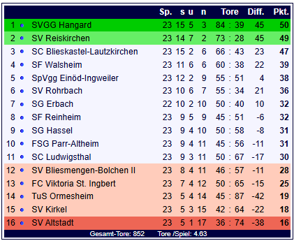 Der SC Blieskastel-Lautzkirchen bleibt mit 47 Punkten auf dem 3. Tabellenplatz und weist ein Torverhältnis von 66:43 auf. Der SV Rohrbach steht mit 36 Punkten auf Rang 6 und hat ein Torverhältnis von 55:34.