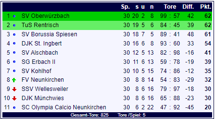 In der Kreisliga A Bliestal ging es spannend zu, wie schon lange nicht mehr. Die ersten Drei - Oberwürzbach, Spiesen und Rentrisch - lieferten sich bis zum Schluss ein Kopf-an-Kopf Rennen um die Meisterschaft. Am Ende siegte der Oberwürzbach mit 5:2 gegen den SC Olympia Calcio Neunkirchen, da auch der TuS Rentrisch mit 5:0 bei der DJK Münchwies gewinnen konnte steht nun ein Entscheidungsspiel an, dessen Sieger Meister ist und dessen Verlierer in die Relegation einzieht. Der SV Borussia Spiesen hat als Tabellendritter keine Chance auf den Aufstieg. Alle Tore und Spiele bei SCB-Online...