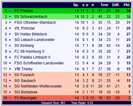 Der VfB Theley hat am 14. Spieltag der Verbandsliga Nordost einen Last-Minute-Heimsieg gegen den FV Biesingen gefeiert. Im Schaumbergstadion sahen 240 Zuschauer eine umkämpfte Partie mit einem späten Siegtreffer. In der 51. Minute ging Theley durch ein Eigentor von Thomas Sell in Führung. Biesingen zeigte sich wenig beeindruckt und kam in der 63. Minute zum Ausgleich: Melih Adiguzel erzielte seinen ersten Saisontreffer nach einem feinen Zuspiel von Hakan Göktas, der damit seine zweite Saisonvorlage verbuchte. In der Schlussphase war Theley die aktivere Mannschaft und wurde in der Nachspielzeit belohnt: Matthias Gard traf in der 90. + 1. Minute zum 2:1 – sein fünfter Saisontreffer. Mit diesem Sieg verbessert sich der VfB Theley auf Rang 11 der Tabelle (19 Punkte, 27:36 Tore). Der FV Biesingen bleibt mit 3 Punkten auf dem letzten Platz (16:52 Tore).