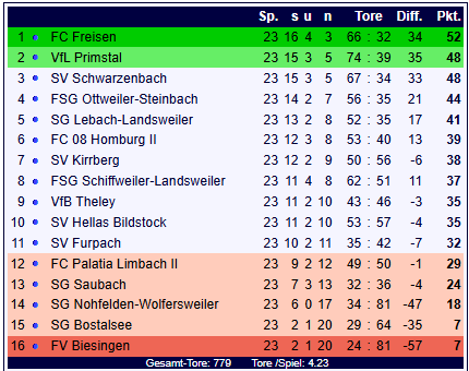 Der FC Freisen behauptet mit 52 Punkten und einem Torverhältnis von 66:32 weiterhin den ersten Tabellenplatz. Die SG Lebach-Landsweiler bleibt mit 41 Punkten und 52:35 Toren auf Rang 5 der Tabelle.